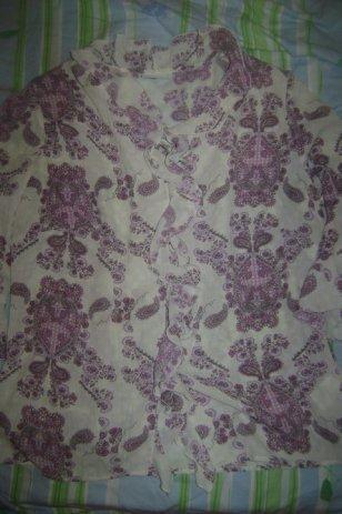 ... kratkim rukavima, žute boje rozo-crvenim prugama. Prednje klasično kopčanje i mali džepić na prsima. Jastučići u ramenima (lako se odšiju), mali bočni prorezi. Lagan i rastezljiv materijal.