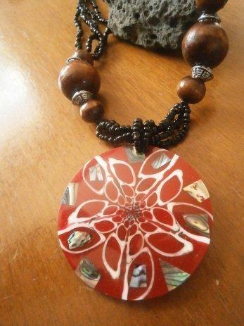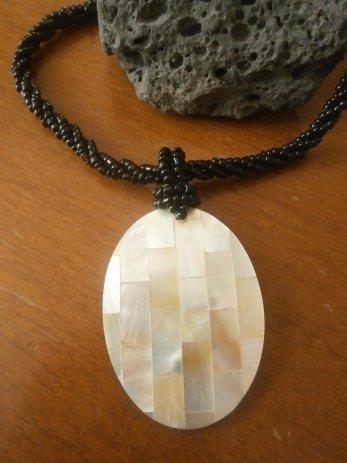 Nova ogrlica sa dugoljastim privjeskom, cca 5 cm, mozaik napravljen od komadića sedefa.